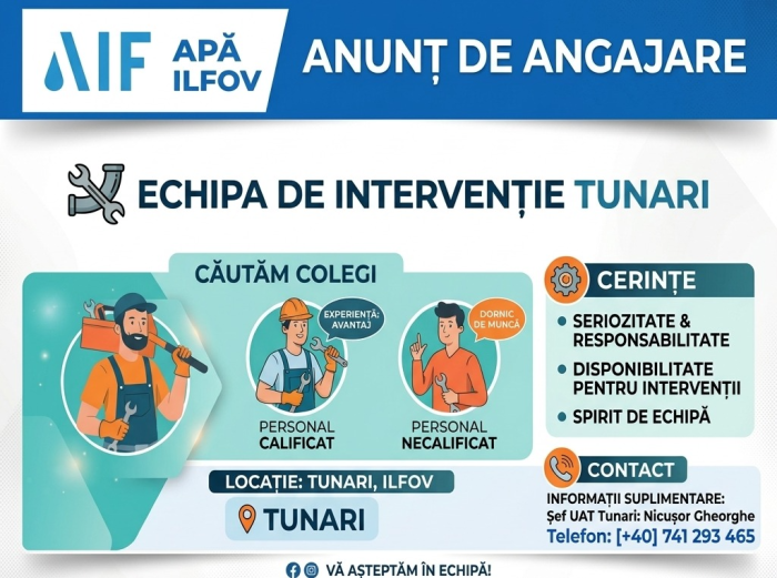 Apă Ilfov angajează personal pentru echipa de intervenție în localitatea Tunari, atât calificat, cât și necalificat.
